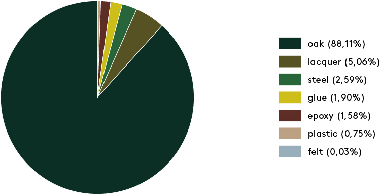 Wij maken voor ieder product een "product eco passport". Een duidelijk overzicht van de materiaalsamenstelling met gewichtspercentages van ieder product.