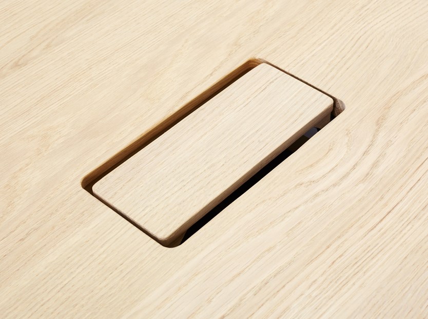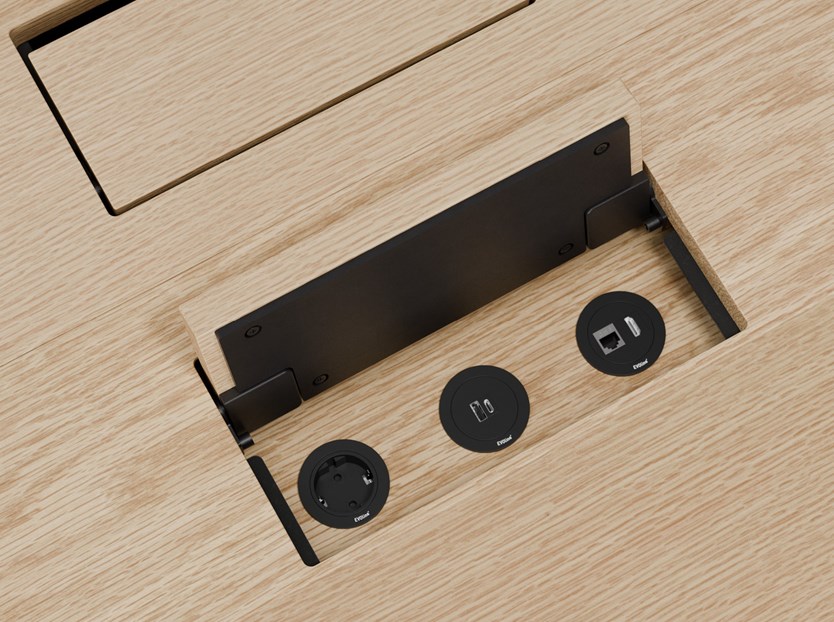 Alle benodigde aansluitpunten zoals stopcontacten, data-aansluitingen en usb-portals, zijn volledig geintegreerd in het tafelblad en bijna onzichtbaar weggewerkt onder een klep met doorlopend houtbeeld. De elektrificatie-mogelijkheden zijn verder verfijnd voor optimaal gebruiksgemak.