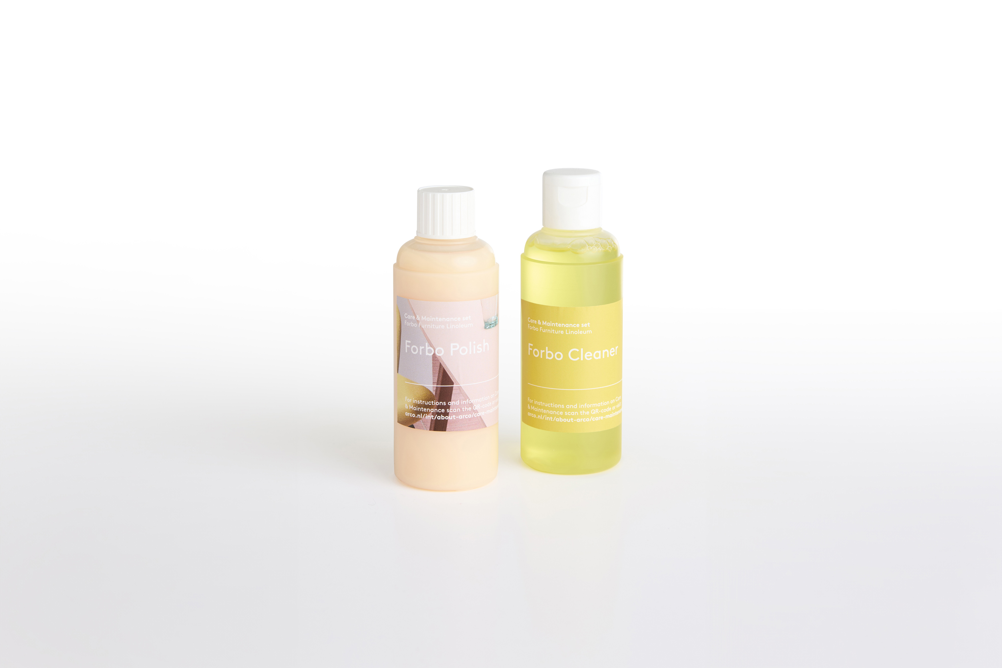 Onderhoudsset voor periodiek reinigen en verzorgen van Forbo/linoleum oppervlakken; voor langdurig mooi en beschermd oppervlak. Dagelijks onderhoud: afnemen met een vochtige doek en warm water, eventueel met milde schoonmaakmiddelen (pH-neutrale zeep). Altijd nareinigen met schoon water en het oppervlak goed laten drogen.