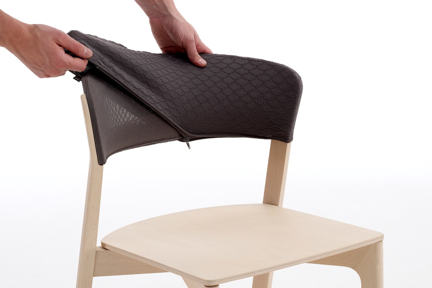 Prestwich hat sich im Lauf der Zeit auf das Design von Möbeln, und dabei vor allem auf Sitzmöbel spezialisiert. „Das hat sich mehr oder weniger so ergeben. Je häufiger man sich mit etwas beschäftigt, desto besser man etwas kann. Es bewegt einem ständig und es fallen einem immer bessere Ideen ein.“ Das Design von Stühlen ist aber auch eine schwierige und anspruchsvolle Aufgabe. „Es gibt zwar sehr viele Möglichkeiten, aber man kann auch sehr viel falsch machen. Zwischen verschiedensten Elementen muss man ein harmonisches Gleichgewicht finden: Ästhetik, Komfort, Ergonomie, Kosten, Herstellungsverfahren, Material usw. Das führt zu interessanten Herausforderungen, die ich nicht als Problem oder Kompromiss erfahre.“ Der gestrickte Rückenbezug des Café Chair ist daher eine schöne Lösung für eine Konstruktion, die ebenso leicht wie stark sein muss. „Schließlich soll er auch Schwergewichte tragen können. Außerdem geht man in Restaurants und Hotels nicht gerade vorsichtig mit Möbeln um.“