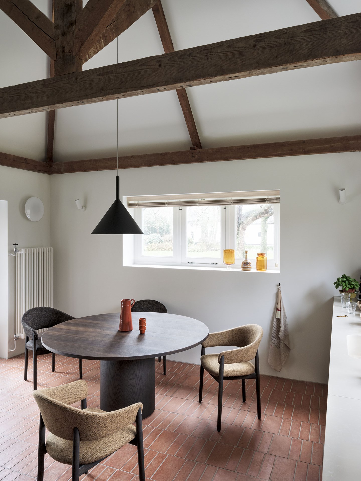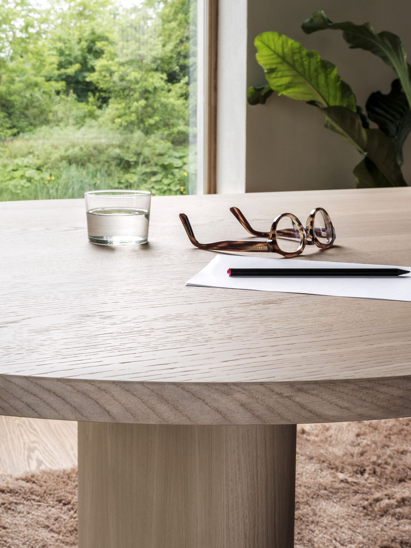 Die bestehende Kami-Kollektion wird um eine neue, schlankere Säule und mehrere kleinere Größen erweitert. Durch die neue, schlankere Säule ergibt sich mehr Freiheit bei der Positionierung der Stühle, da der Raum zwischen den Säulen größer ist. Tischen wurde um eine neue, schlanke Säule erweitert. Der Kami Round hat einen Durchmesser von 150 cm.