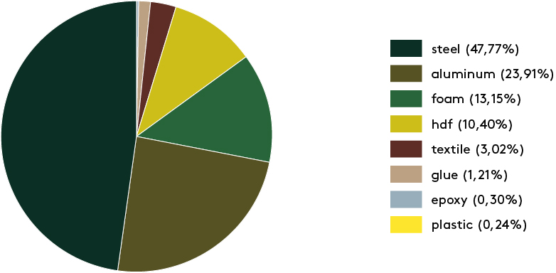 € 1056,-Wir erstellen für jedes Produkt einen „Product eco passport“. Ein klarer Überblick über die Materialzusammensetzung und deren Gewichtsanteile eines Produkts.