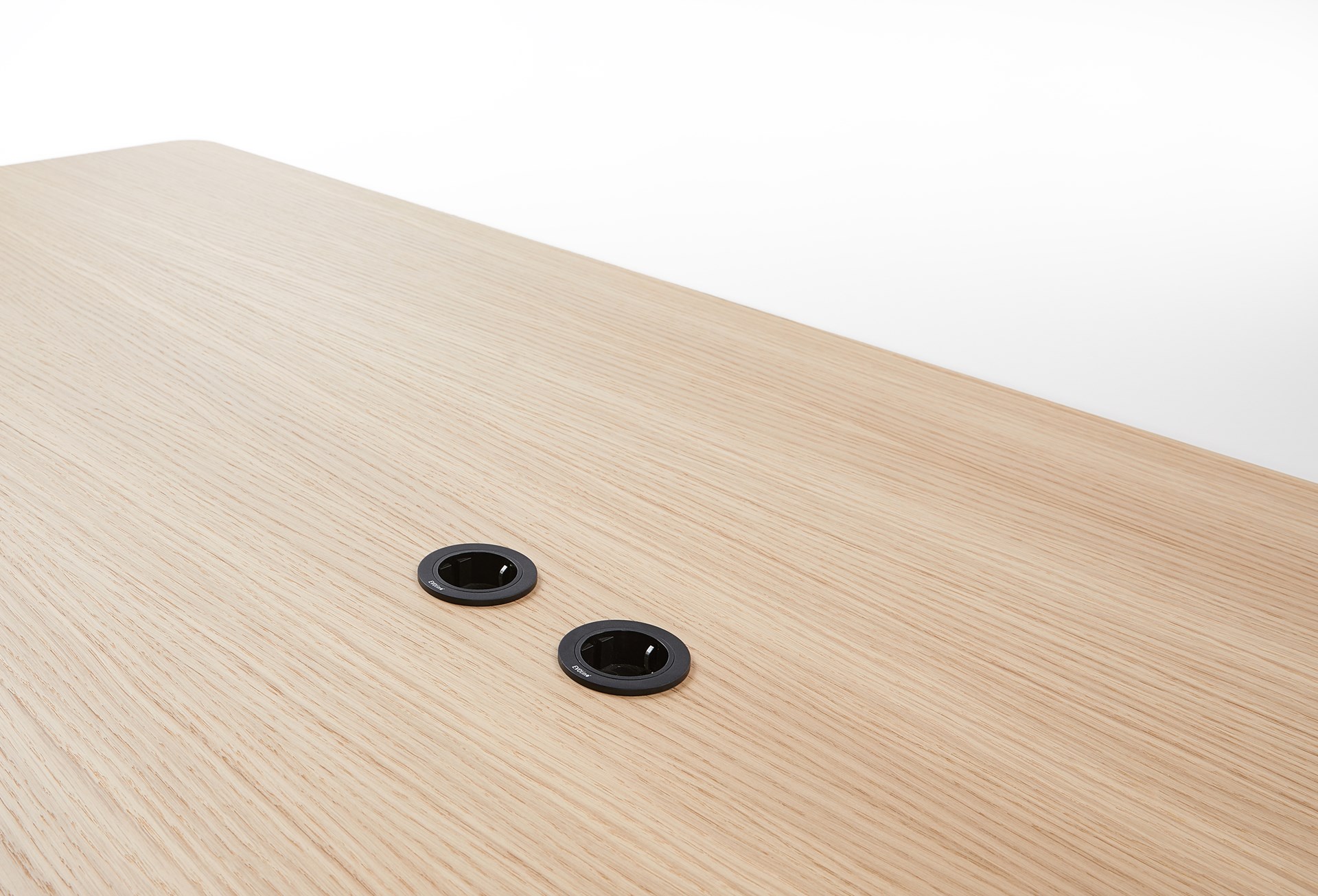 Our cable management solutions integrate seamlessly into our tables, keeping connections accessible yet discreetly concealed through wooden lids and integrated electrical spots.
