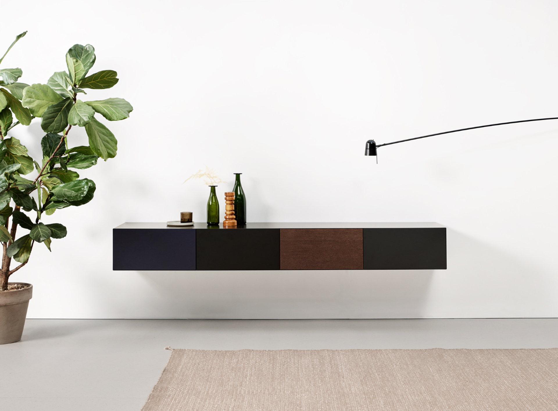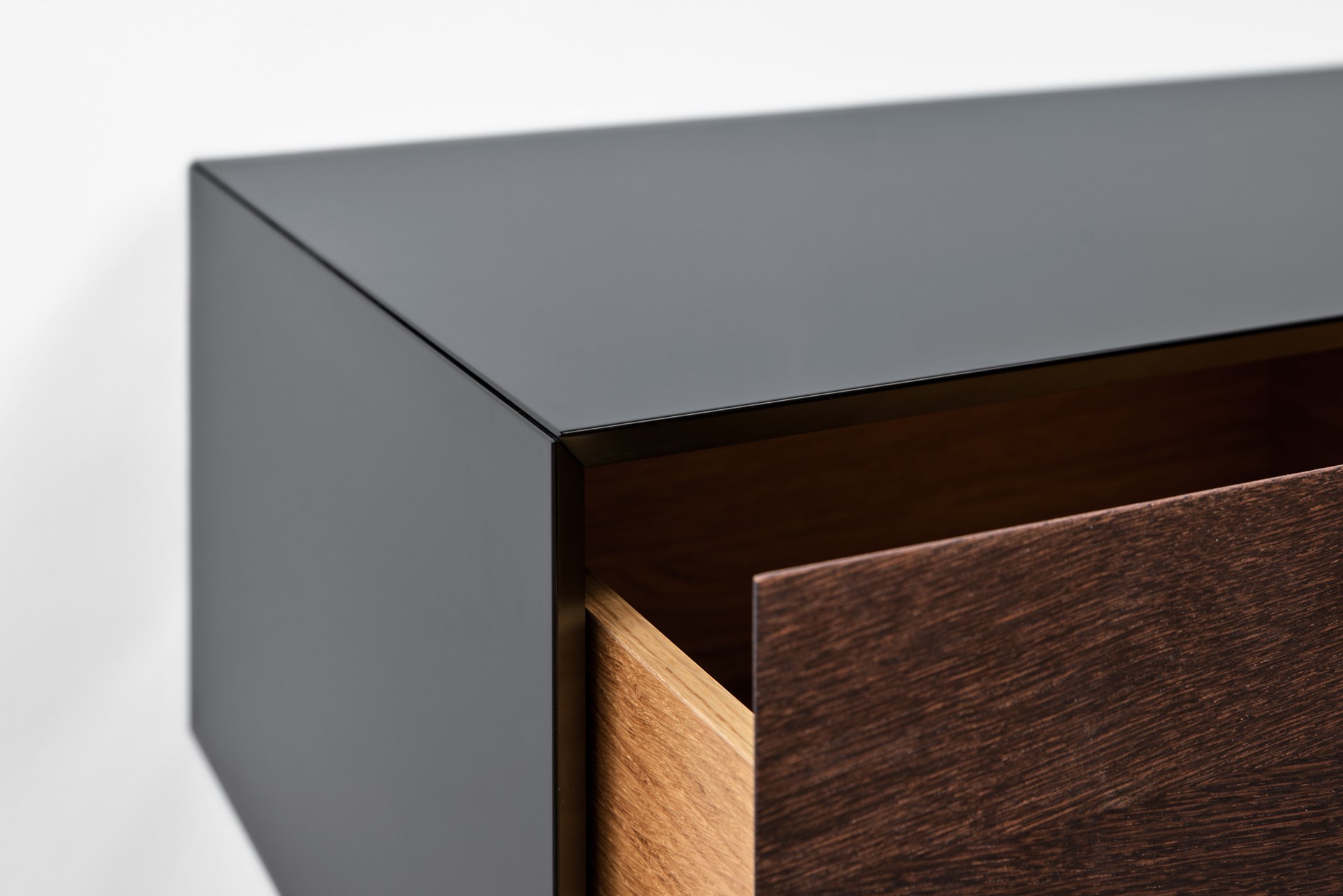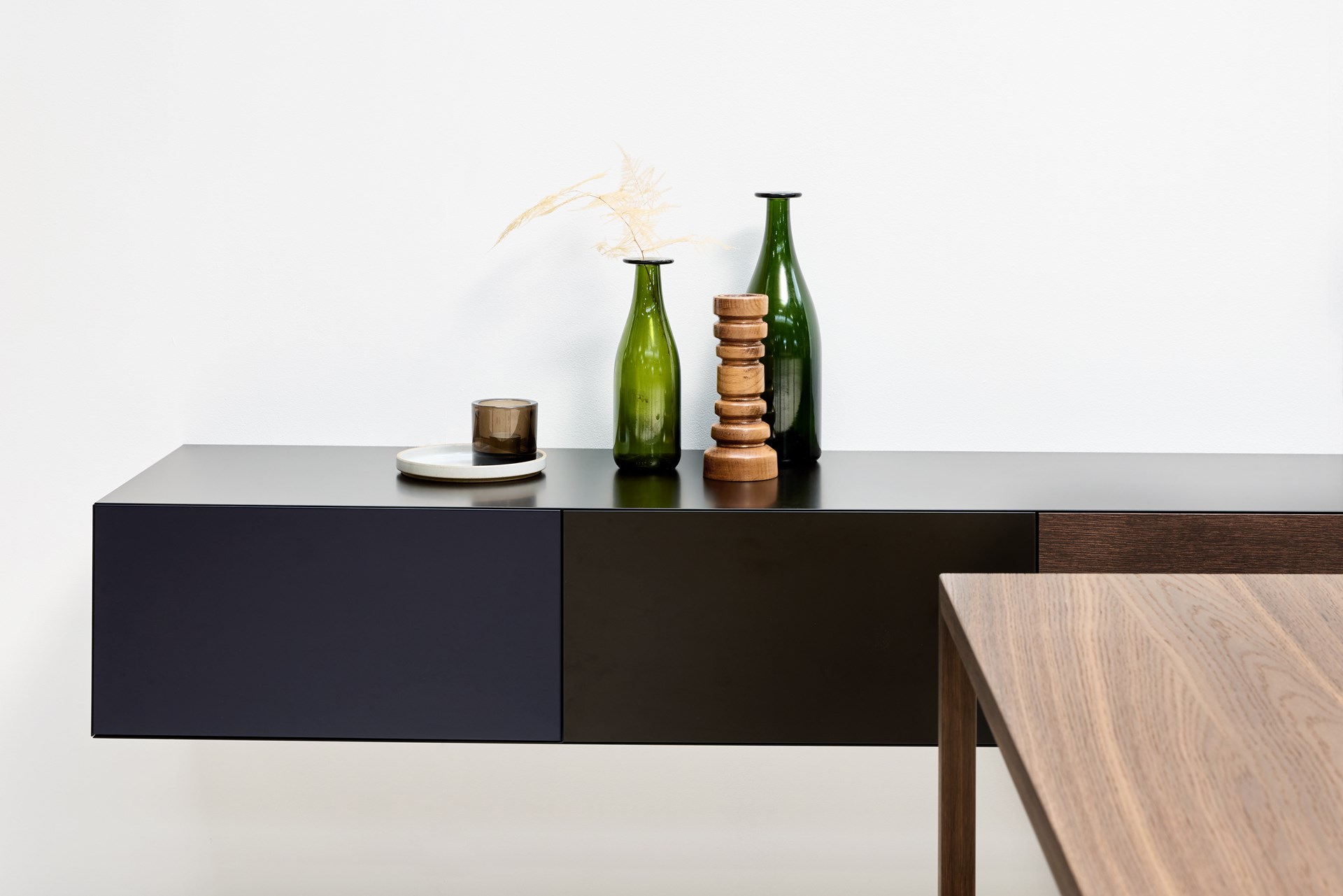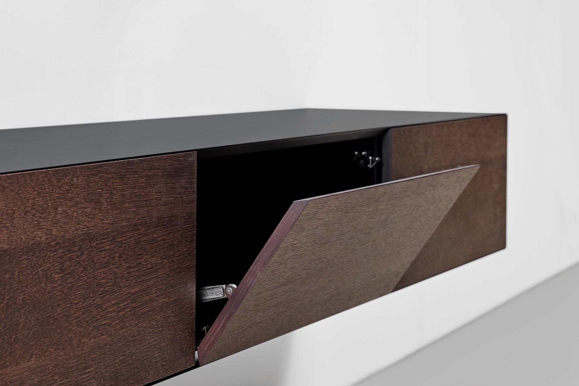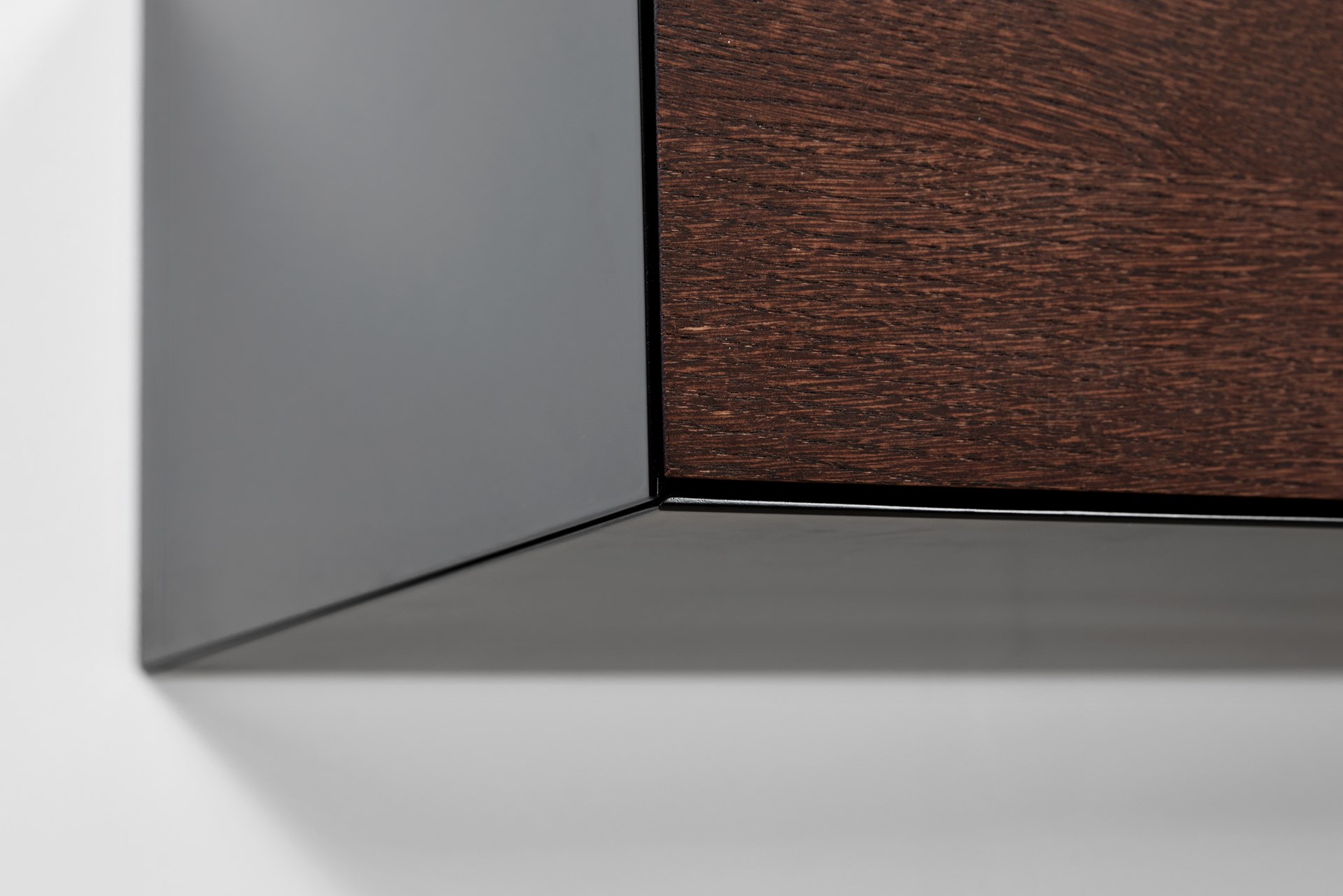 Each configuration employs Vision's distinctive 45-degree facets and nine-centimeter module system. Each module can be equipped with various fronts—drawers, flaps and media fronts. Additionally, each module offers cable management options.