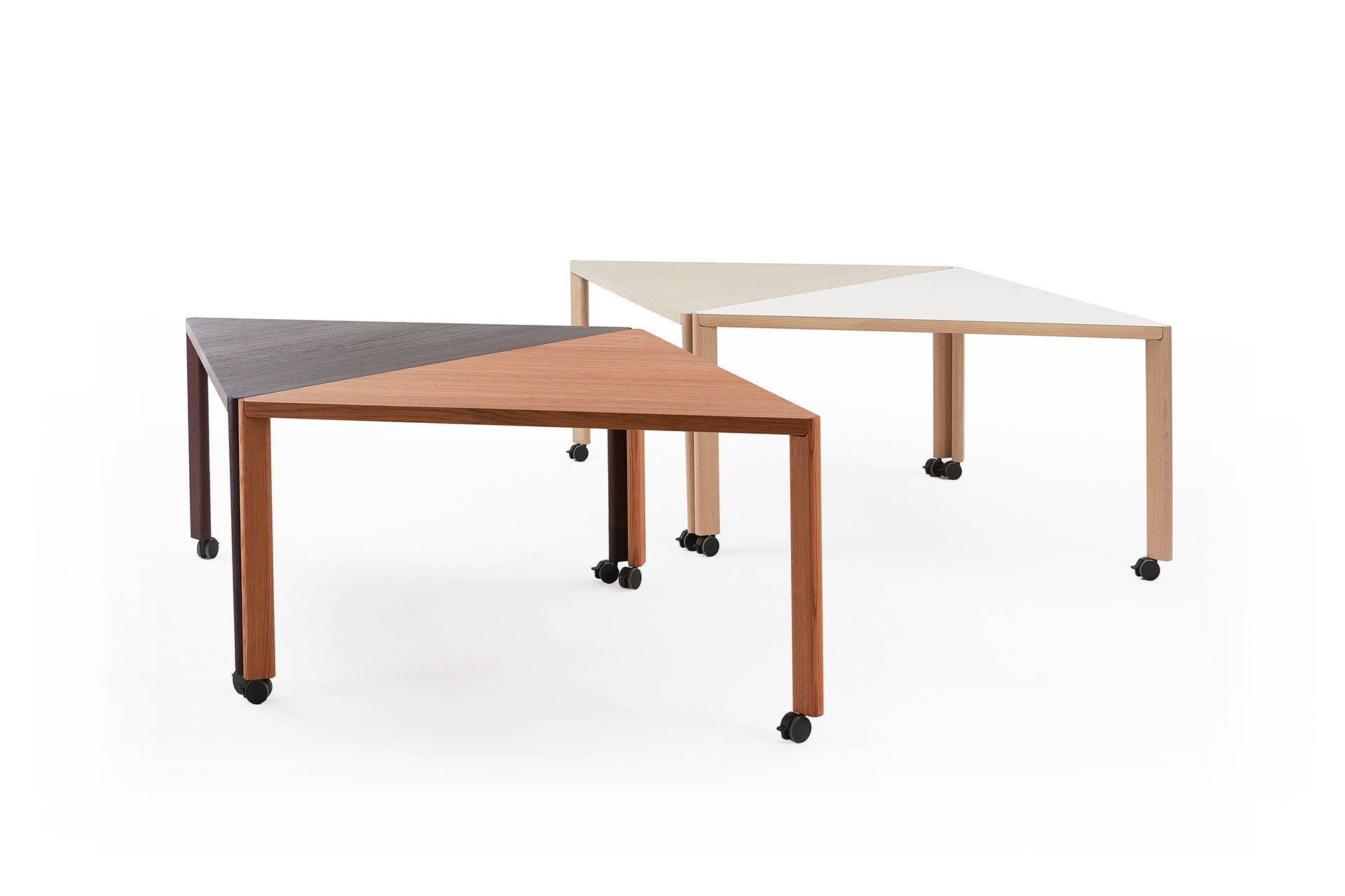 Move is available as both a low and high table. The legs and frame are made of solid wood with optional castors and hidden magnets that let you connect and create playful configurations. The triangular top is available in semi-solid wood, veneer or HPL for a beautiful and sturdy surface to work, play and create. As with every Arco table, it is produced in the Netherlands, uses certified wood (FSC/PEFC/STIP) and water-based lacquers.