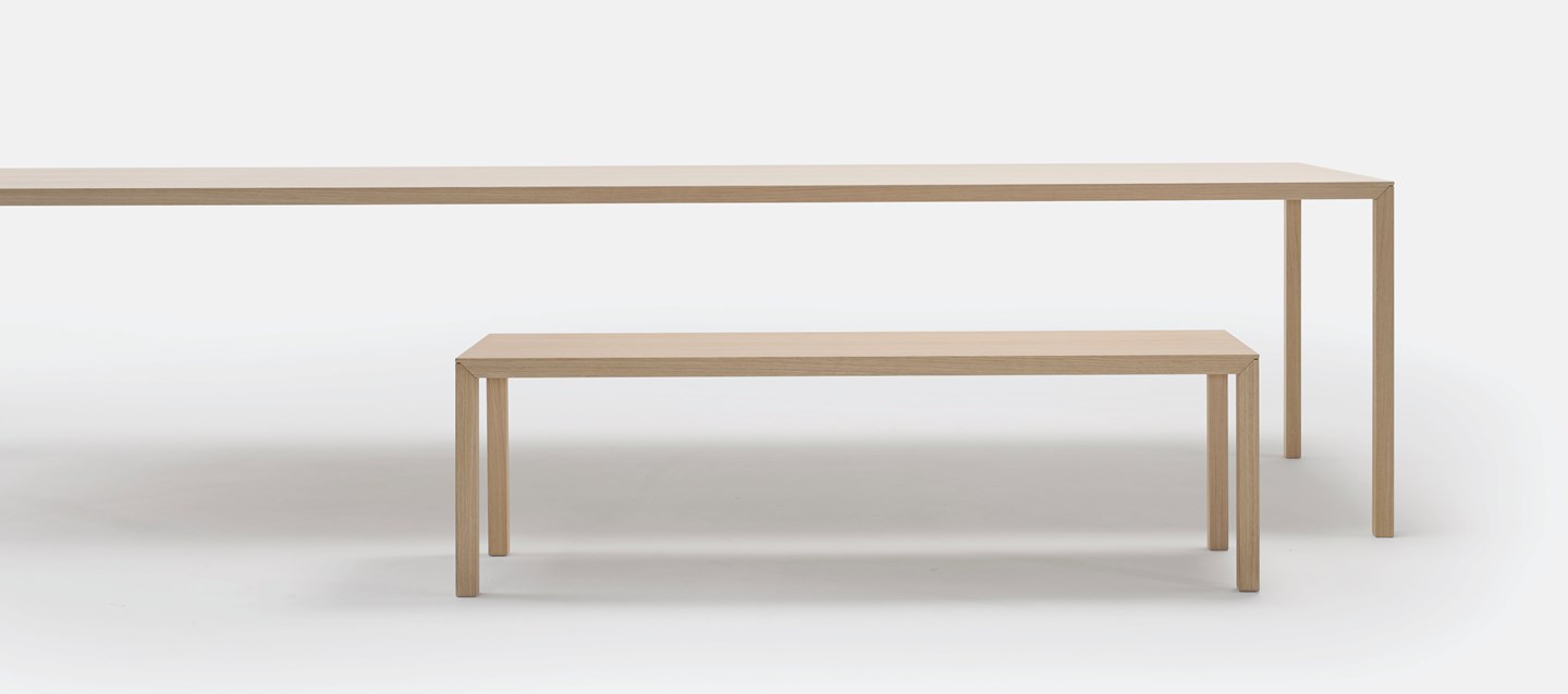 The seemingly 'impossible looking' Slim table involves the use of an innovative, strong steel sandwich construction with a lightweight honeycomb-structure core with a veneer wood frame. This construction allows the traditional Slim to reach an overall length of 280 cm, with the table top and legs having a thickness of 2.8 cm. The Slim+ collection goes a step further with a total uninterrupted length of 360 cm, with a table and leg thickness of 3.8 cm. This makes the Slim table timeless minimalism.