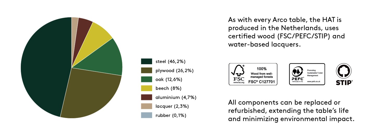 With height ranging from 60 to 105 cm, the HAT is suitable for work, both standing or sitting, and different desks or wheelchairs fit easily underneath it. All components can be replaced or refurbished, extending the table’s life and minimizing environmental impact. As with every Arco table, its produced in the Netherlands, uses certified wood (FSC/PEFC/STIP) and water-based lacquers.