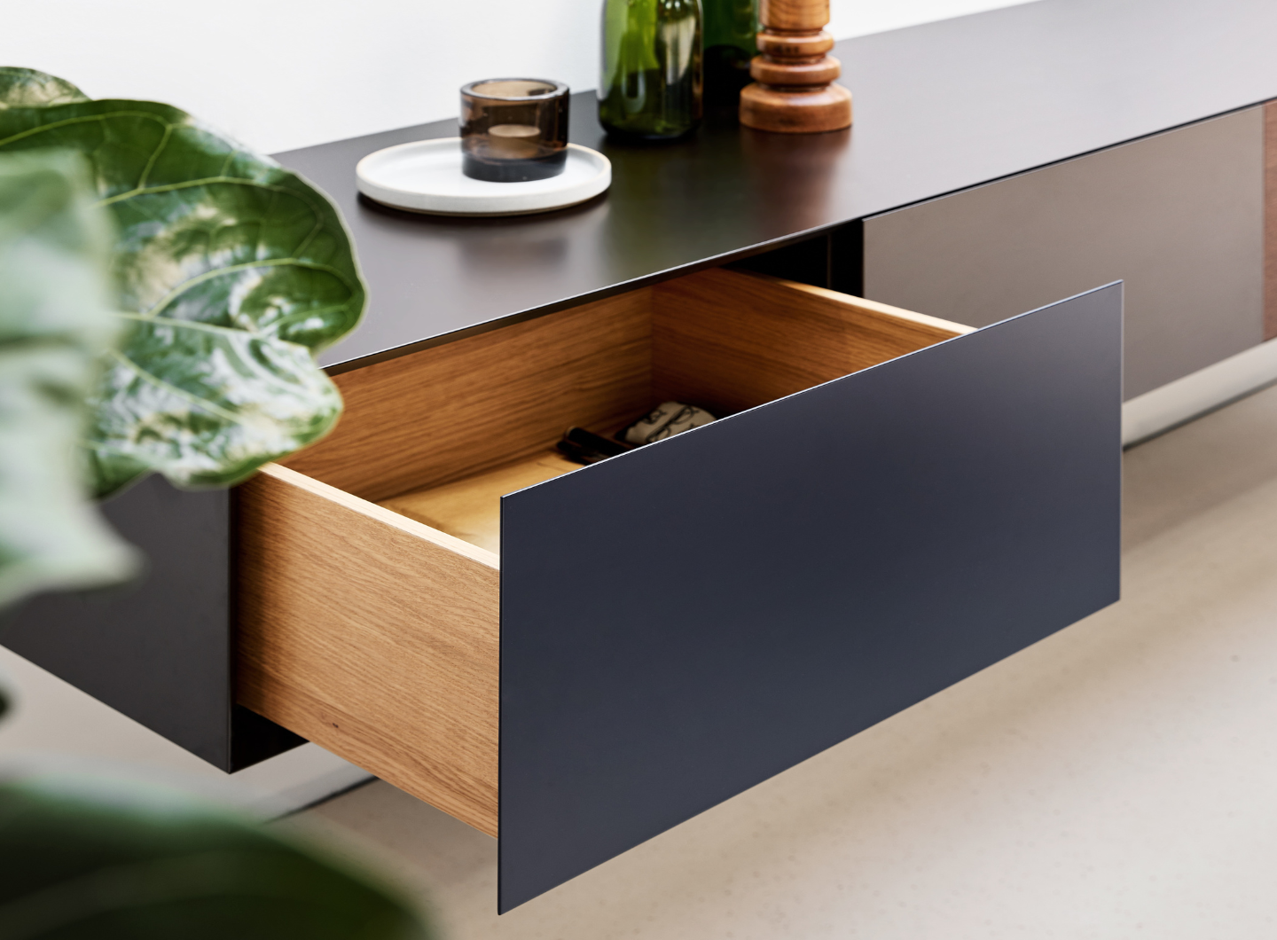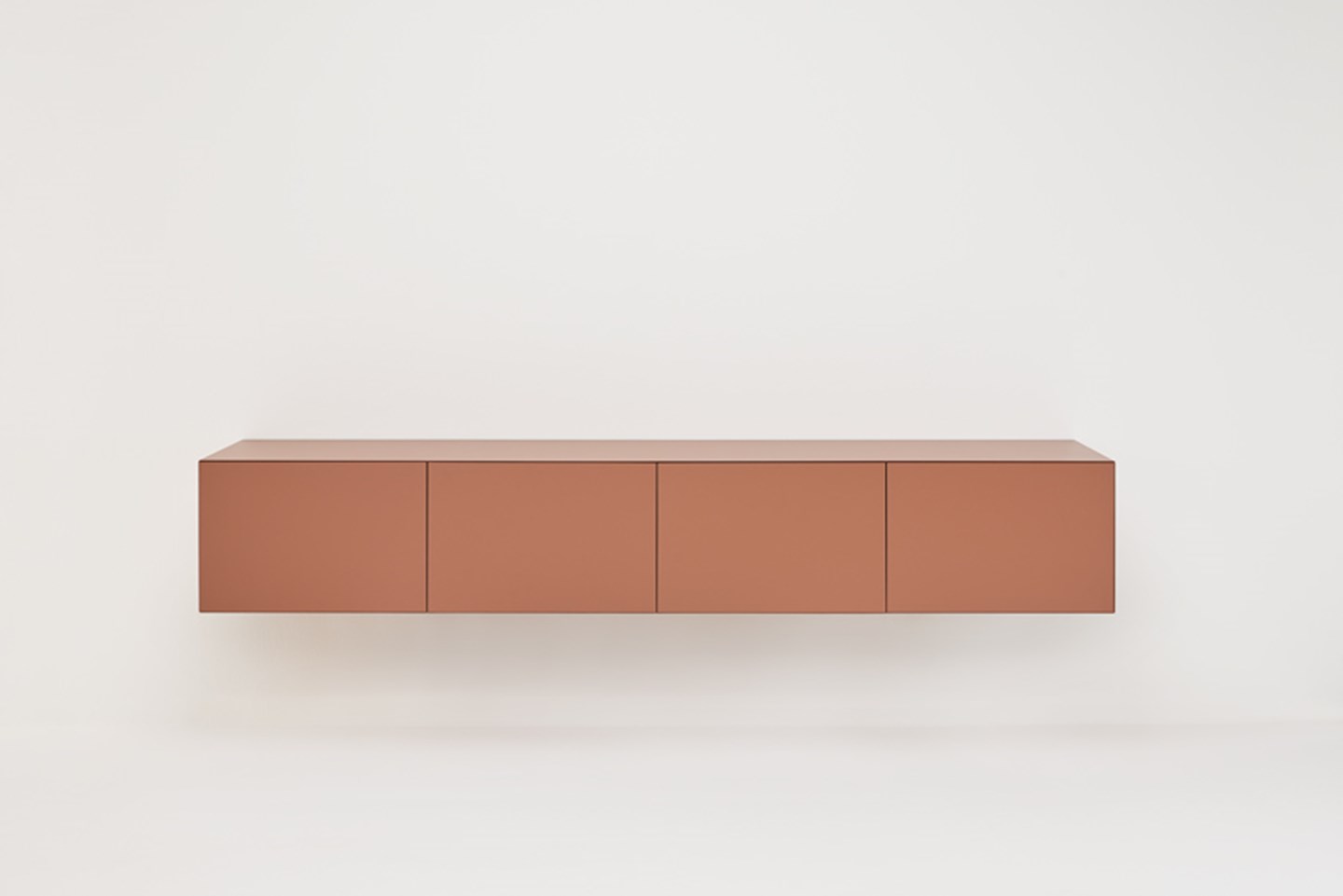 Vision Selected 2 is a hanging cupboard composed of repeating modules, each consisting of a drawer, a hinge and two doors. Vision Selected 2 comes with optional cable management, ensuring that extraneous wires don’t disrupt its clean, precisely engineered lines.