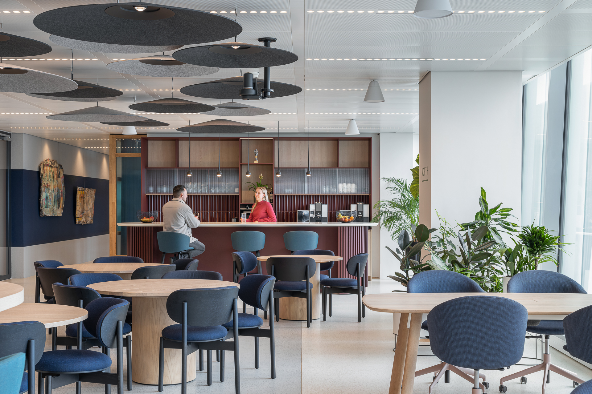 For the office project by CBRE, in Amsterdam, the Netherlands, Arco supplied Kami tables in different configurations, Grid program tables, Close chairs, and Re-volve chairs.