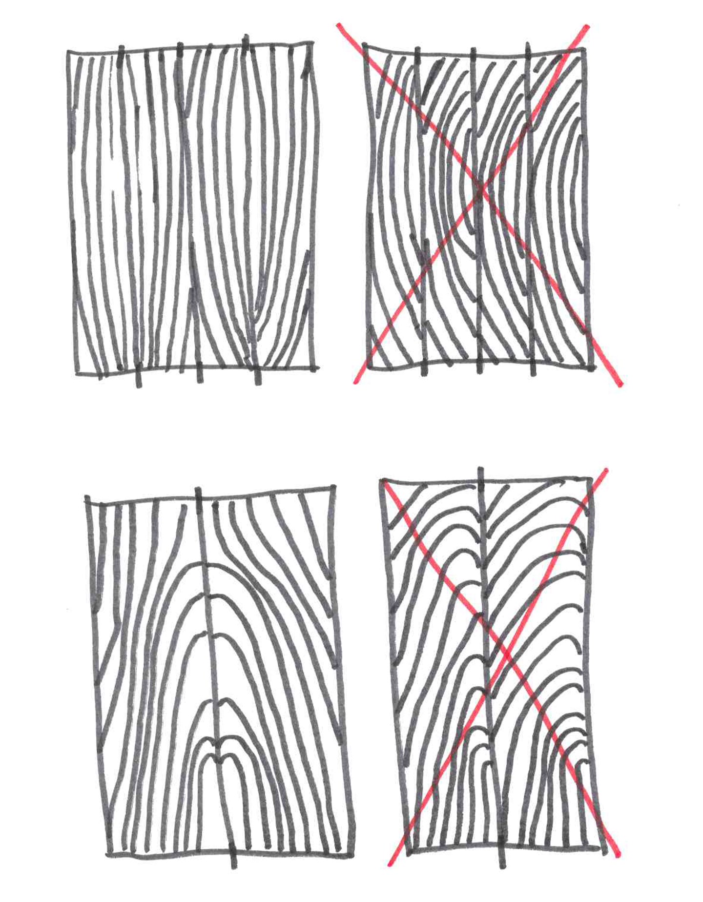 Het fineerbeeld wordt bepaald door de manier waarop het fineer gesneden wordt en door de manier waarop het gevoegd wordt. Het voegen is het aan elkaar verlijmen van de vellen. Het verlijmen gebeurt aan het 0,6mm houten randje, een precies werkje. We gebruiken een speciale methode voor voegen. De vellen fineer worden namelijk gespiegeld, zodat de patronen in het hout optisch doorlopen en er een gelijkmatig houtbeeld ontstaat.