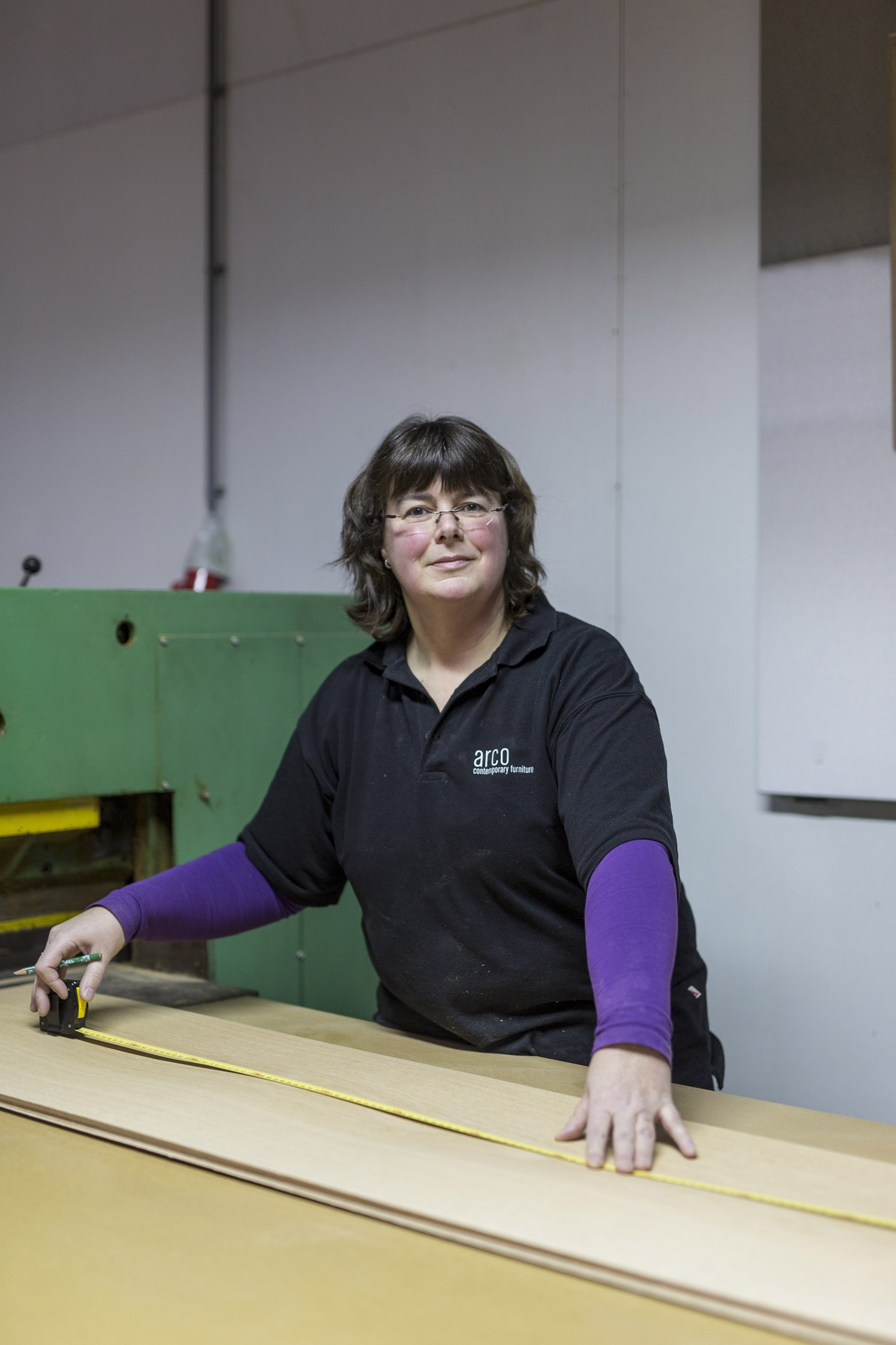 We produceren in onze meubelfabriek in Winterswijk met de nieuwste technieken, maar daarnaast draait het toch ook echt om mensenwerk, het ambacht en vakkennis. Liefde voor het vak en aandacht voor kwaliteit, dat is wat we met z’n allen delen. Iemand met net zoveel passie voor haar vak is Gina te Hoonte. Ze werkt al 27 jaar bij Arco en is fineerder. “Ik koop het fineer in, sorteer het op kleur en op structuur. Ik ben verantwoordelijk voor het totale fineerbeeld en bepaal hoe een meubel eruit gaat zien." Geen geringe taak dus, maar die is bij Gina in uiterst bekwame handen.