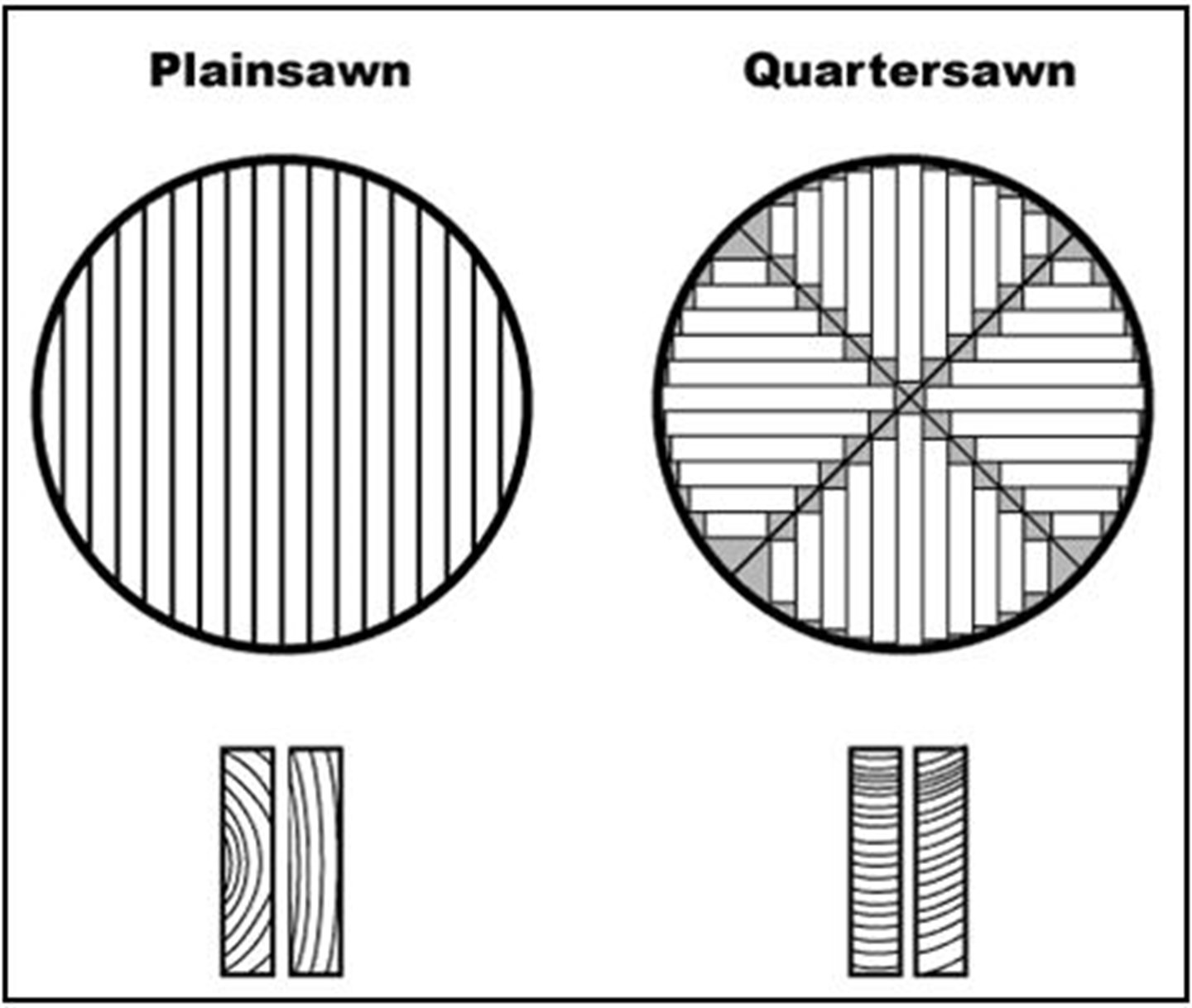Iedere fineerstam ondergaat bij ons een zorgvuldige inspectie voordat deze wordt ingekocht. Het bepaalt immers hoe onze tafels eruit gaan zien. Gina legt uit: “De verschillende delen van een stam worden voor verschillende producten gebruikt. We maken onderscheid tussen kwartiers-delen (quartersawn) en dosse delen (plainsawn). Het kwartiers hout geeft een heel rustig fineerbeeld, wij gebruiken deze delen bijvoorbeeld voor onze Slim tafel en de Side Store kasten. De dosse delen zijn de fineervellen waarin een ‘vlam’ tekening zichtbaar is. De dosse delen gebruiken we vooral voor grote opstellingen.”